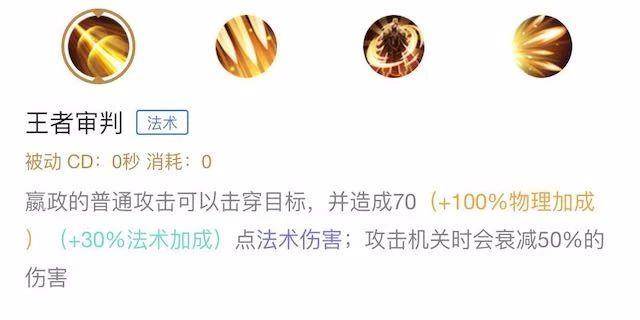 解析:嬴政的普通攻击为穿刺伤害,也就是对一条直线上的所有敌人造成伤害,在基础攻击的基础上,还增加了一定的法术加成,但他的普通攻击属于法术伤害。这个被动使得嬴政在释放完所有技能的真空期时,还能够利用平A来补充伤害,尤其是在游戏前期的对拼中非常占优势。