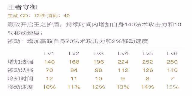 解析:被动为嬴政提供法术攻击力和移动速度,主动释放则给自己增加一个护盾,能够抵挡一定的伤害,并且在护盾存在的时候,额外增加自己的法强和移动速度,这个护盾只有受到伤害才会打破,若没有受到伤害它是永久存在的。所以尽量保持自己身上一直存在着护盾,不仅可以抵挡伤害,还能提高自身输出能力。