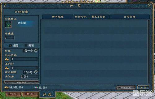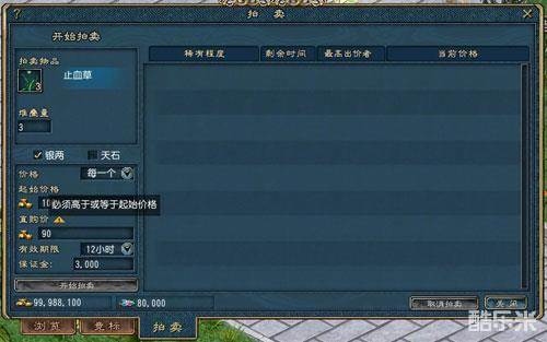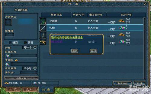 商品拍卖需要缴纳一定数额的保证金:每个物品为500两,叠加物品按叠加数累加。如果在商品拍卖结束前点击该商品,可选择取消拍卖,但同时将失去该商品的保证金。如果在商品拍卖结束后仍无人出价,则所拍商品会以邮件附件的形式返回拍卖者的邮箱,保证金不退。