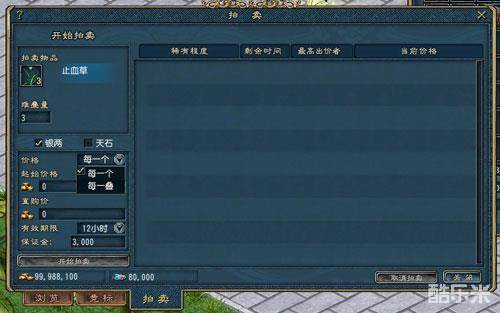 确定所售商品及其售卖数量之后,须选择交易币种。金币拍卖与天石拍卖不可同时进行,仅可选择其中一种。为商品定价时,请注意,定价对象分为“每一个”和“每一叠”两种,分别用来对不同的量进行定价。