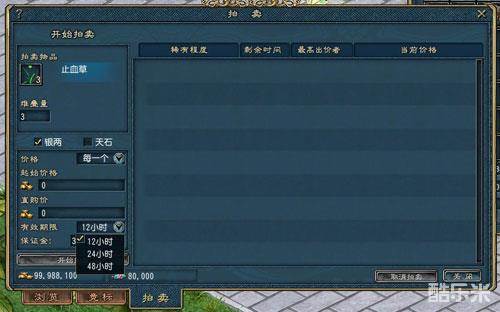 接下来,点击拍卖有效时限的下拉框按钮,可选择拍卖时限。12小时、24小时、48小时表示物品物品在拍卖行接受竞拍或一口价的最大时长,可供售卖者酌情选择。