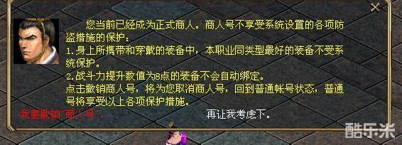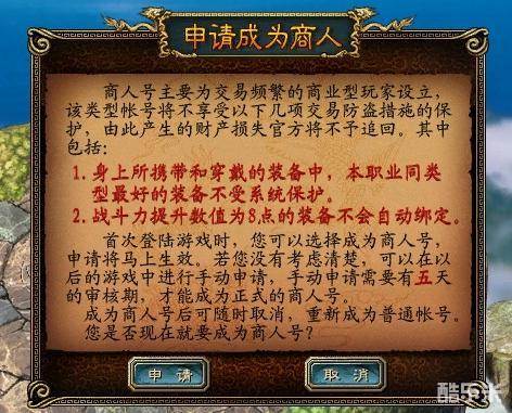 注明:一旦成为商人号后将视为自动放弃帐号防盗保护措施,若发生装备丢失,官方将不承担装备追回的义务。