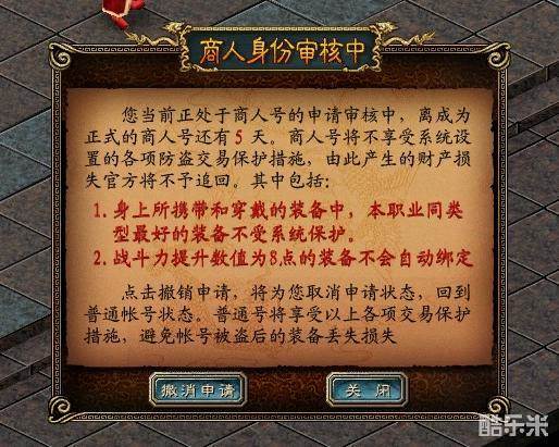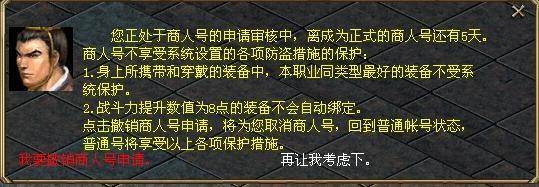 5天之后,才会成功成为商人号。在审核期间,如有想撤消商人号申请,可点击NPC“商行授号特使”或者点击每次登陆都会自动弹出的“商人身份审核”界面中的“撤消申请”按扭。