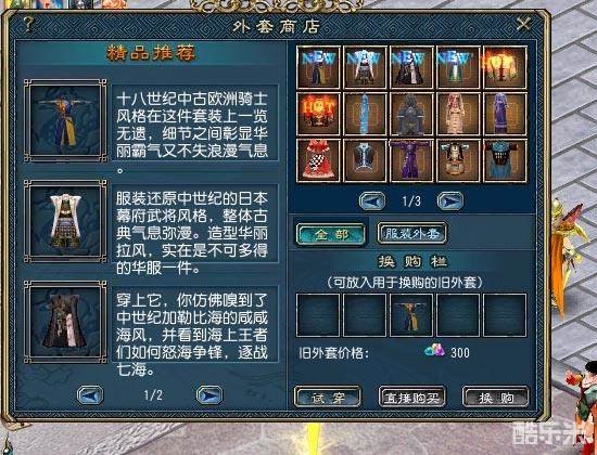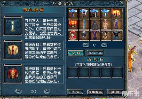 于此同时,外套换购商人还推出了体贴人心的试穿服务。诸位侠士只需首先点击界面上的“试穿”功能按钮(鼠标会变成衣服样式),再点击商品栏里的任意外套,即可获得30秒的外套试穿体验哦!