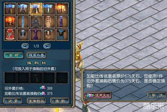 除了试穿服务外,外套换购商人重点推出的便是以旧换新的外套换购功能啦。诸位侠士只需在换购栏内放入已有的外套,就会立刻显示旧外套可以抵价的天石数目。不同的外套可抵价的数目多少也各不相同。