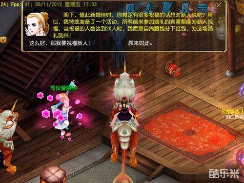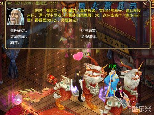为此,证婚人月老特意还带来了为新人与宾客准备的新婚贺礼呢!这份沉甸甸的贺礼包括了180个内含10万银两的大红包;180瓶喝完可以提升10分钟经验值的上等美酒;180个吃下去可以提升5点气力值的小气力丸以及180颗流星。这些贺礼将在主人的要求时,每次60个撒在屋内各处。届时,在场的宾客可随意拾取。