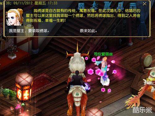 千万不要小看这颗绣球哦,它不仅仅是幸福美满的象征,更蕴含了新人的浓浓的祝福呢!幸运地抢到绣球的宾客将可以获得绣球中的3天祝福时间、50万银两、120分钟经验值与200点修行值呢!