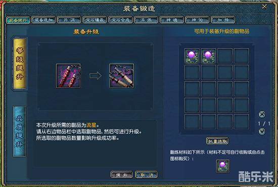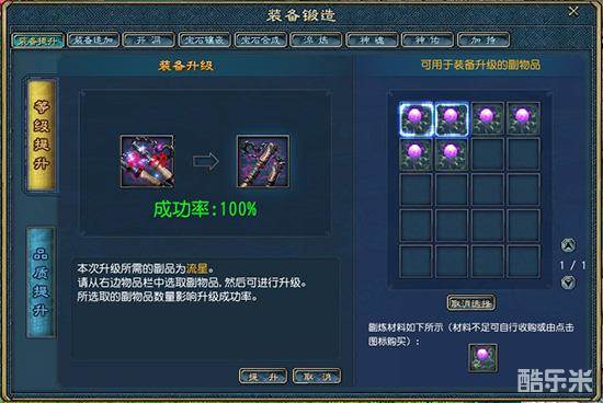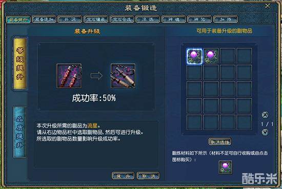 等级提升:从右边的物品栏选择要升级的装备,选取装备升级的副物品,所选取的副物品数量影响升级的成功率,升级栏里会根据你所选择的副物品数量显示提升的成功率。