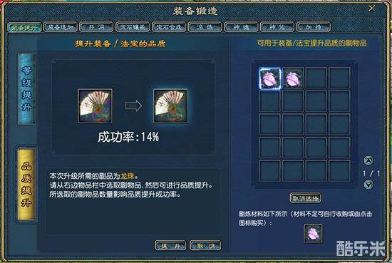 品质提升:从右边的物品栏选择要提升品质的装备或法宝,选取提升品质的副物品,所选取的副物品数量影响品质提升的成功率,升级栏里会根据你所选择的副物品数量显示品质提升的成功率。选取副物品后,点击“提升”按钮,即可为装备或法宝提升品质。