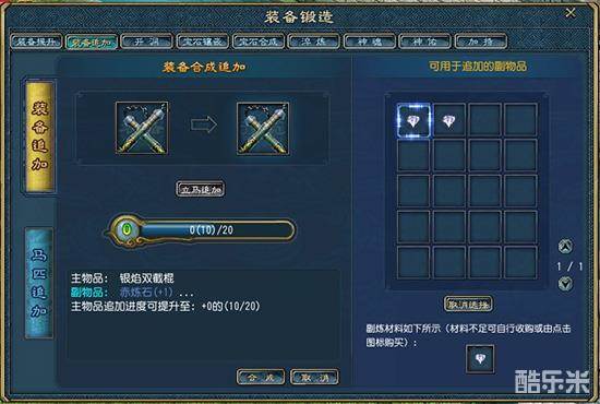 装备追加:从右边的物品栏选择要追加的装备,选取用于追加的副物品,所选取的副物品数量影响追加的进度,追加栏里会根据你所选择的副物品数量显示可追加的程度。点击“合成”即可到达可追加的程度。