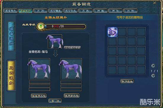 大家可以通过“锻造”按钮的“装备追加”界面进行装备追加或马匹追加。