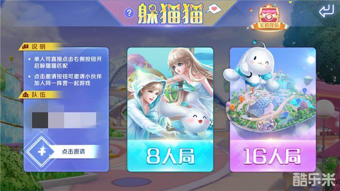 QQ炫舞手游新版本更新后,在游戏主页面会新增加一个“游乐场”,点击进入游乐场,可以看到躲猫猫与兑换商店。点击躲猫猫就可以进行躲喵大作战了,可以进行单人参与,也可以叫上一名好友一起加入你的阵营来匹配对局,还可以提升你们的亲密度哦!选择页面右边的8人局、16人局,决定了本局参赛选手的数量,选择对局后,系统将会进行玩家匹配。