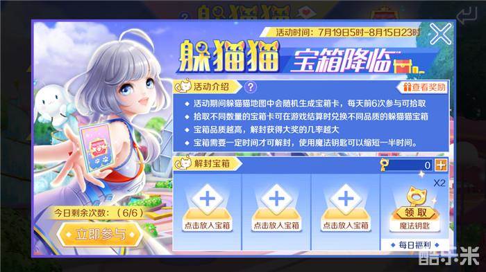 如果阵营胜利、追捕者击杀了躲藏者或者躲藏者存活到了最后、获得别人支持时,还可以获得额外的奖励哦。各位喵神们,快快更新版本进入QQ炫舞手游中一起体验躲喵喵大战的乐趣吧,另外还有限时宝箱活动可以一同参加哦!
