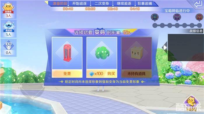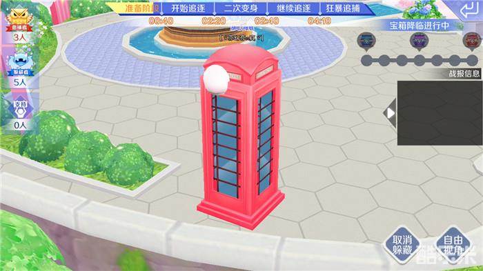 怀着好奇心试验了第一把游戏,系统随机确定了我是要躲起来的人,进入游戏后有两个选项让我选择变身,或者是变身一个红色的电话亭,或者是花费100点券变成一堆绿草。我先选择当个免费的电话亭看看怎么玩吧!选择了游戏形象以后,可以有一段时间去找合适的位置躲藏,藏好了就确定位置,就不能移动了,我顺势就站在了路边,可是没想到,居然被秒杀了!