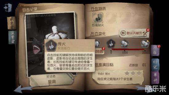 怨魂狱火:在追击求生者时、被眩晕以及四名未倒地的求生者成功破译密码机会后增加怨愤,积累到一定程度可消耗怨火使用传火技能。