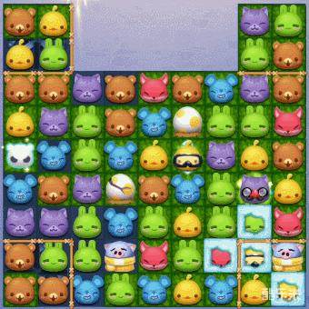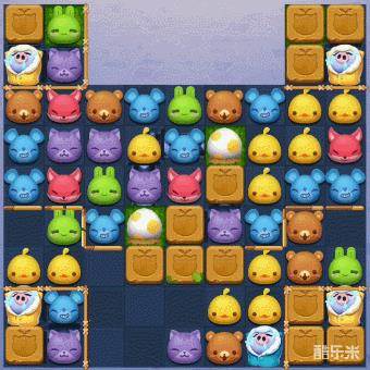 2、棋盘的左右下角和棋盘中间,都有大量的障碍物,所以我在消除左右上角的障碍物时,需要先顺带将棋盘中间的木箱和可消栅栏消除,扩大我们的匹配消除空间。再找尽快将左右下角的木箱和爱斯基摩猪消除,为后续更好的延伸草坪做好准备工作。