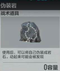 8、伪装岩:继吉利服之后,吉利岩隆重登场,顾明思议,就是伪装成一块石头!可以移动,但是不能携带枪支,石头可以回收,受到一定伤害会被击破!该道具相对较稀有。