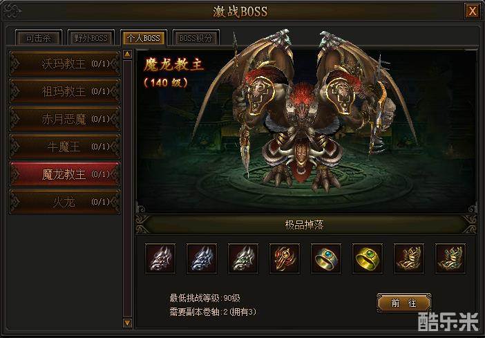 个人BOSS根据等级依次开放,等级越高,可以挑战的BOSS越强大。每个BOSS每天都可以挑战一次,进去后无论是否成功击杀BOSS次数都会消耗,进入之前一定要做好准备。高等级的个人BOSS地图需要消耗副本卷轴才可进入,副本卷轴可在未知暗殿掉落或花费绑元购买。