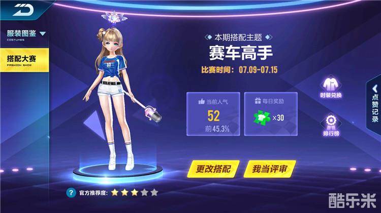 搭配大赛圆了大家一个设计师的梦,赛车手们既可以参与其中当选手,也可以pick选手为他们点赞。搭配大赛每周都有一期不同的搭配主题,着装度达到20以上就可以参赛了。而系统会对赛车手们的搭配给出官方推荐度,评星越多,被推荐的概率越大。当然如果你的搭配既符合主题又能吸引眼球,相信可以轻松获得别人的点赞。