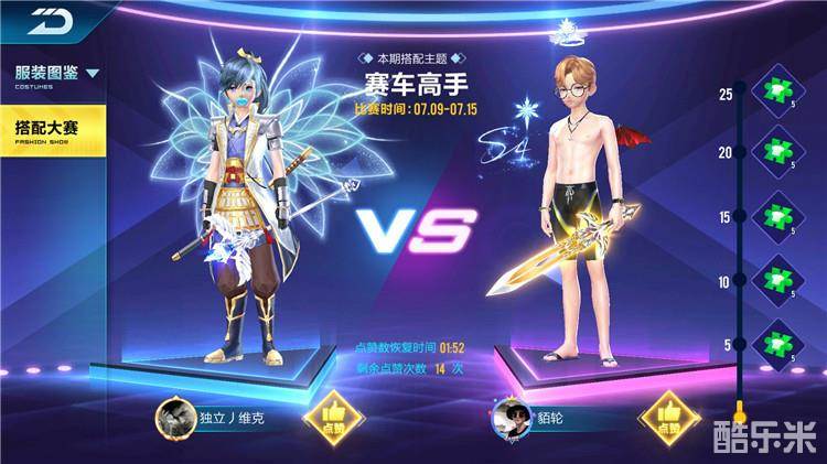 不过你仅仅只是想当评委的话,那就点击【我当评委】进入评委界面。赛车手们将要同时面对两名参赛选手,然后将宝贵的点赞投给其中一人。其中点赞次数累计上限为15次,每消耗一次,点赞数据恢复时间需要2分钟。想要学习时装搭配的赛车手们,记得每天都要来搭配大赛参与点赞喔。