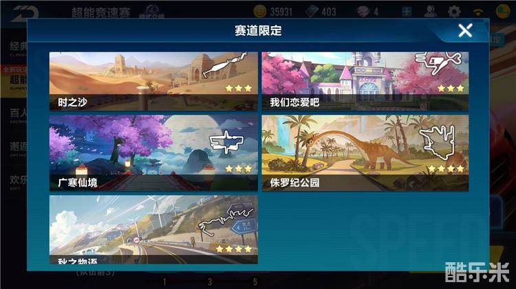 与此同时,为了照顾到各个实力层面的玩家,超能竞速赛在赛道的选择上做了一些限定。其主要赛道为2星-3星图,我们的熟悉的【玫瑰之恋】【彩虹风车岛】等都榜上有名,而难度最高的仅为4星图,分别是【侏罗纪公园】【秋之物语】。玩家可以打消赛道门槛的顾虑,把比赛的重心放在技能的选择和搭配上。