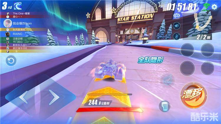 后者可以让自己和队友都进入隐身状态,自身获得加速和撞墙集气保护的效果,并且不会被大脚车碾压而减速,是一个最贴心的保护技能。面对没有红色大脚车的选择时,玩家一定要选择浅蓝色的隐身,确保自己和队友可以快速冲出扎堆的混战区的同时,利用隐身状态下高集气效率,更高效的存满氮气,并且穿过对手还能获得小喷。