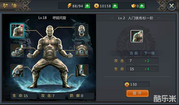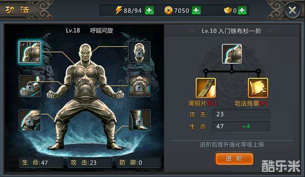 进入后的界面如下图所示:大侠们可以选择不同的部位进行提升,提升后可以增强基础属性。提升需要消耗一些铜币。