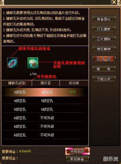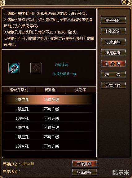 如图,当我们放入装备后可以查看该装备所带的孔,首先需要选中需要升级的孔,此时系统会自动判定此次升级所需要的材料,如果我们拥有材料的话,点击“开始升级”即可升级所选择的孔。使用孔升级功能的时候只能一步步的来升级,比如:3级孔升到6级,我们需要先升4级,然后升5级,最后升6级;