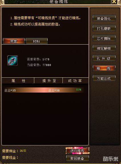 精炼装备可以选择花费荣誉和材料,使用荣誉很简单,放入装备后只要我们的荣誉足够,点击“进行精炼”即可开始精炼;