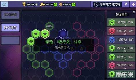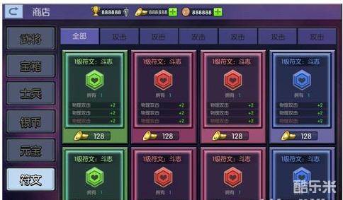 符文可以在商店购买,分别有绿色印记、红色符印、蓝色雕文三种符文,每个主公等级都有对应的符文解锁数量。一般的符文会一直有效果,特殊符文则需要触发使用条件,比如翻盘符文要在建筑少于30%才生效,持续时间也有规定。