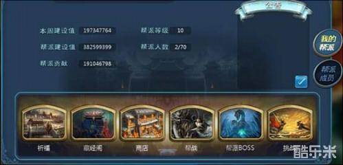 如图所示,帮派内还拥有很多小功能。从左到右依次是:祈福、藏经阁、商店、帮战、帮派BOSS、挑战。