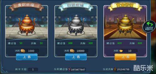 祈福:也就是大家熟知的捐献,分为青铜祈福:1000铜钱=50帮贡,白银祈福:10000铜钱=300帮贡,黄金祈福:10元宝=600帮贡;帮派均获得等值建设值。祈福是最简单,也是最快捷的提升帮贡以及帮派建设值的方法,每天可都别忘了哦。