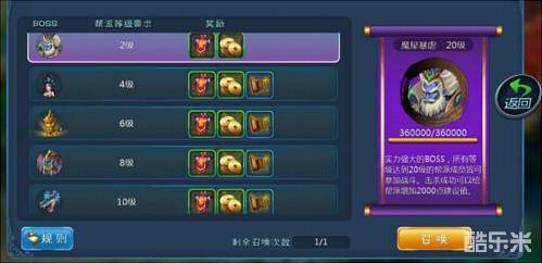 帮派BOSS:帮派BOSS的召唤相较于前几个功能,拥有较多的限制,需要帮派等级最少达到3级才可以进行。每天都可以由帮主或副帮主进行召唤,但只有一次机会,击杀BOSS后,帮派将获得对应的建设值,参与战斗的成员根据其对于BOSS的伤害,获得不等的贡献值奖励。而且,BOSS只能在9:00~21:00之间召唤。