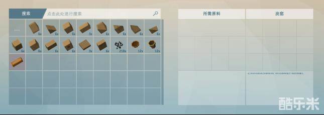 玩家与炭窑互动的界面如下图所示,当前已解锁的可以利用炭窑烧制的物品位于屏幕左侧,点击相应的物品,其制作配方会在屏幕右侧显示。