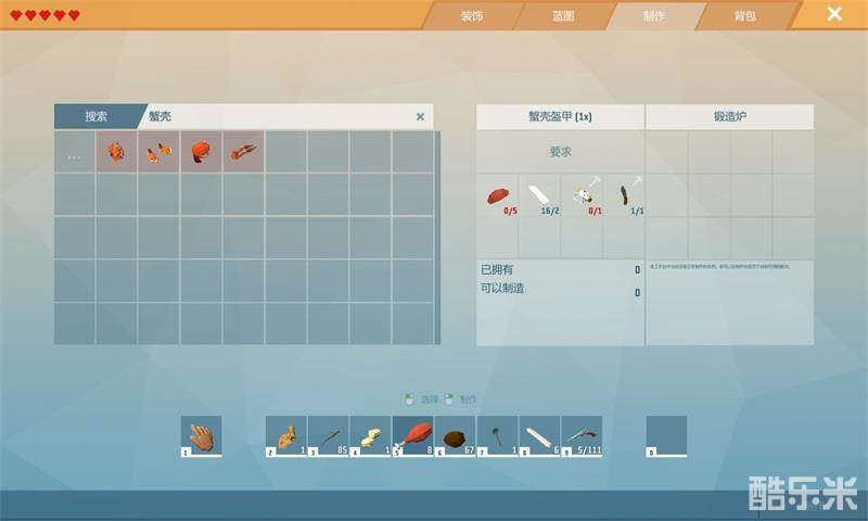 蟹壳盔甲所需材料:x5蟹壳、x2布、x1裁缝工具箱、x1任意刀