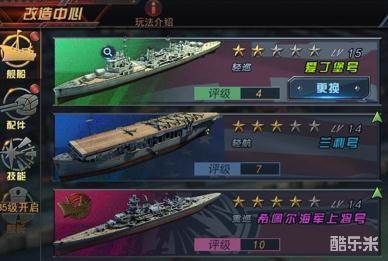 在改造中心舰船页面,能看到升级页面,升级可以帮助战舰属性快速提升,无论是火炮秒伤值、生命数、还是破防、火炮防御、轰炸防御和鱼雷防御,每提升一级,都会有质的飞跃。