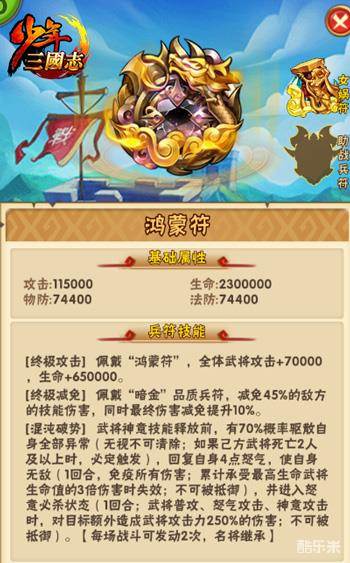 暗金符“鸿蒙符”有着强力的无敌免疫技能,武将佩戴后,可在一定条件内驱散自身的全部异常状态,并使自身无敌1回合。与此同时,武将自身进入怒意必杀状态,可造大量额外伤害。“鸿蒙符”这种无敌免疫加输出的技能组合,可进一步提升阵容的输出能力。