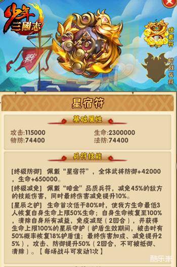 与“鸿蒙符”一同登场的还有“星宿符”,该暗金兵符有着突出的恢复与保护能力,当佩戴武将血量首次低于80%时,可恢复自身以及阵容中低血量武将的大量生命,并为佩戴武将创造一个星辰护盾,该护盾在抵御敌军伤害的同时,还将大幅增加自身的攻击、防御等属性。