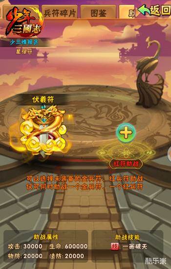 同时,玩家在拥有“鸿蒙符”和“星宿符”两个暗金色兵符后,可以在游戏中激活首个暗金兵符图鉴——“宇宙之阵”,进一步提升上阵武将属性,加强武将的生存和输出能力。