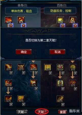 每个职业都拥有双天赋,玩家初始使用的是第一套天赋,在非战斗状态下点击另一天赋的按钮,施法5秒之后即可切换新的天赋加点模板,之前的天赋加点自动保存,玩家可以在需要的时候来回切换天赋以应对不同的情况。