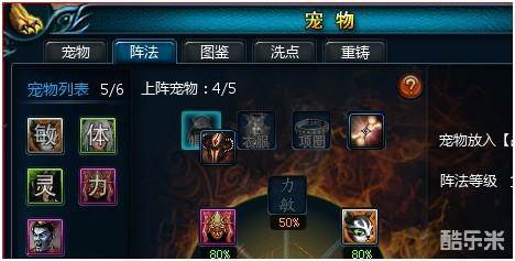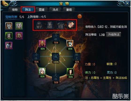 当各位修魔尊者达到80级并获得宠物装备之后点击右下角“宠物”图标或者按下快捷键P进入宠物面板,点击“阵法”页签进入阵法即可看到阵法上方的宠物装备栏。