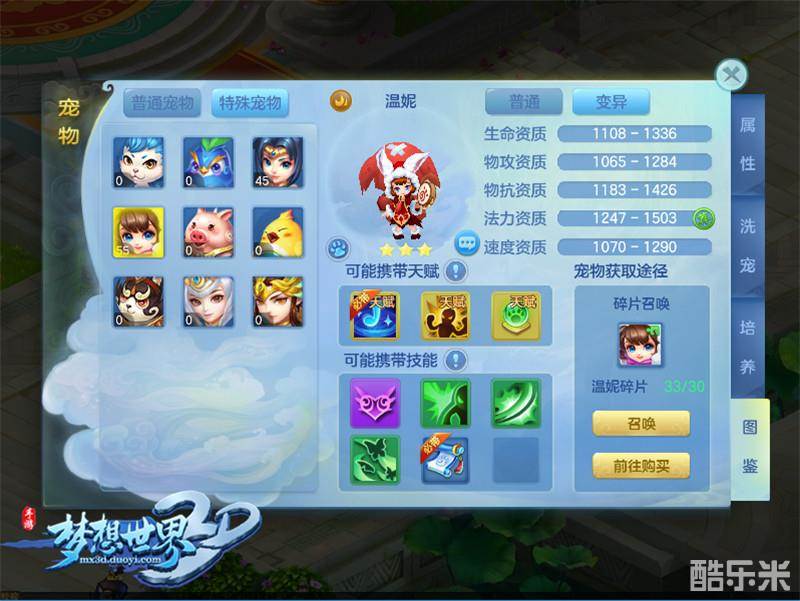 除了必带的天赋技能,小温妮可能携带低级格挡、低级法术必杀、低级灵性、高级幸运等4个技能。在保证法系输出的情况下,生存能力也不容忽视,是pk副本的得力小助手!当然少侠也可以自行使用兽决定制技能搭配。本周更新后,即可通过帮派商店购买宠物碎片召唤宠物,准备入手的少侠不要错过哦!