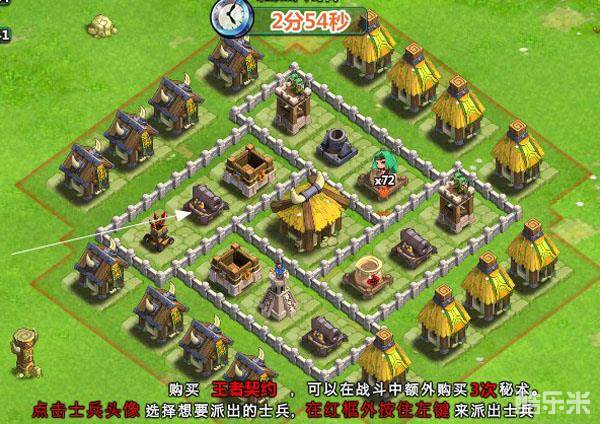 3、攻略:首先胖子沿箭头放下,接着放掉6个炸弹人,灭掉冲天炮后胖子会首先灭掉神坛,同时投放士兵和弓手、医疗师。100%胜利。