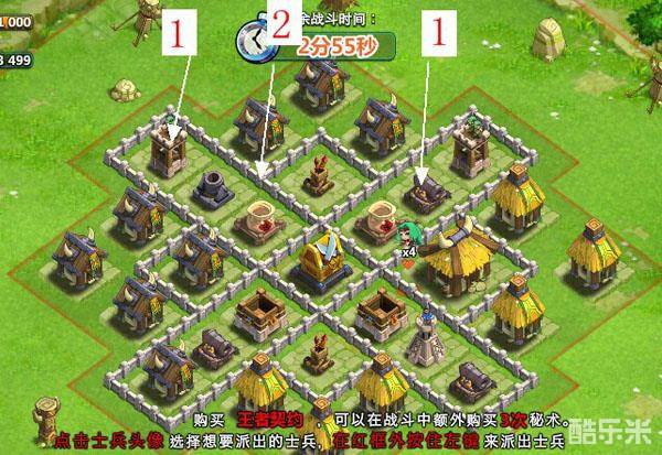 3、攻略:首先2个胖子左右沿1号箭头放下,接着2号位置放下弓手若干,灭掉冲天炮后,正下方位置同样这样办法灭掉冲天和神坛,投放医疗师。100%胜利。