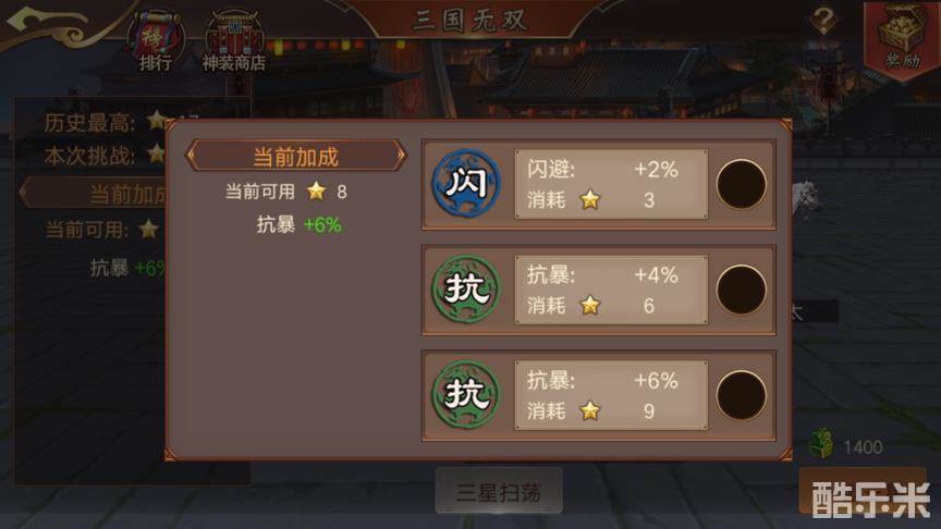 三国无双关卡分三种模式,简单、普通和困难。不同模式会对应有推荐的战力值,主公可选择符合自身情况的关卡模式进行挑战,千万不要盲目选择呀。当然,关卡的难度越高,奖励越好,因此,努力提升实力才是正道。每通关三个关卡会获得一个关卡宝箱,获得的星数越多,宝箱内的奖励越好。我们只要每通关三个关卡,可以消耗星数来选择不同的属性加成!实力与奖励环环相扣,希望每位主公面对挑战都可迎刃而解。
