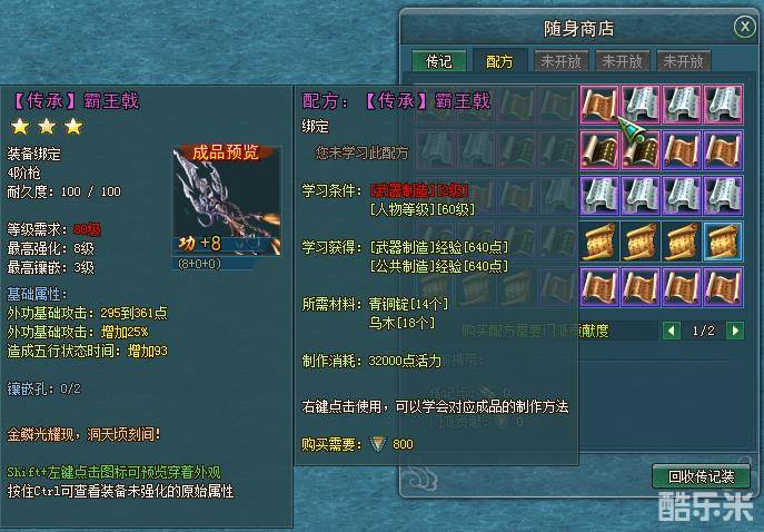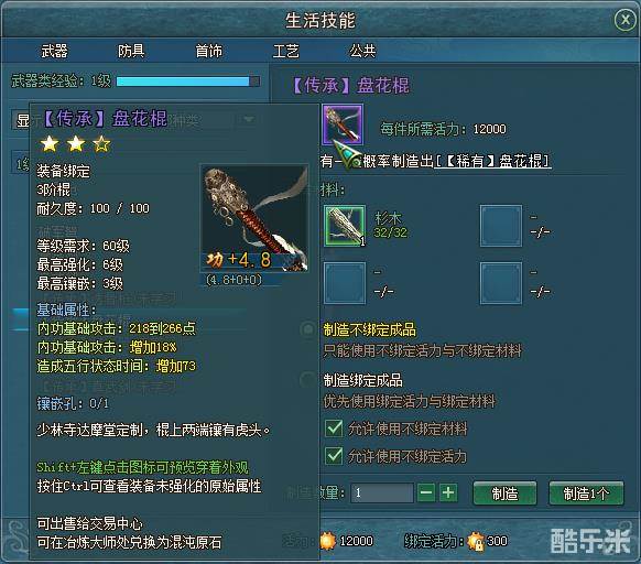 温馨提示:制作过程中,有任何活力或材料是绑定的,则做出的物品也是绑定的。不过,因为有了交易中心,即便是绑定也可以买卖。