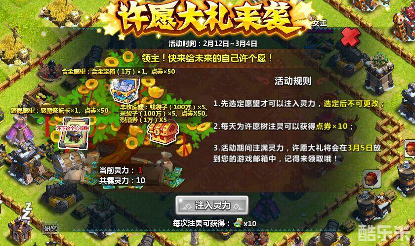 第三,许愿树还是不错的,可以许愿然后注入10次精力也就是10天的时间即可实现愿望,而且每次注入精力送10点券,到3月4日截至,5日通过邮件领取