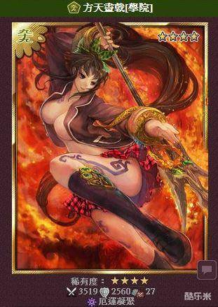 方天这次看不到肚脐眼了呢,直接用大腿挡住了不让看了……出生于乱斗的卡卷土重来,可惜降在了150F,不过技能虽然弱化了,但是攻白值在四星九九中还是挺靠前的,同样拥有群嗨技能让这张卡在九九四星金边群嗨中仅次于原版楔子(还有可堆技的鹿鸣馆,不过能堆技鹿鸣馆基本都可以收超绝了)的卡,和几张公讨35F也可以一拼。甩开同为150F的武田一些距离了,不过和裸舞塔的150F琉球路克(11200/29/小幅高发神攻)比起来还是略逊一筹的,这卡还是传统九攻的流派,高攻高群嗨,就是没高发……