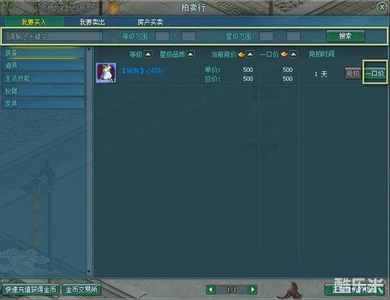 拍卖场的商品有装备、道具、生活技能、秘籍、家具五大类。您可以分类查找要购买的商品,也可以通过关键字、等级、星级范围等快速搜索目标。