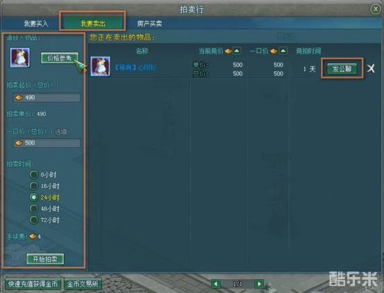 寄售拍卖区左侧是拍卖操作区,可以直接将商品放入物品栏,同时设置拍拍卖起价、一口价和拍卖时间。